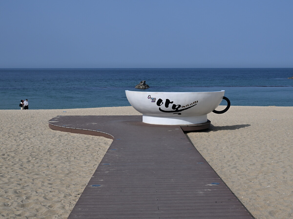 カフェをはしごするのもよし、その合間に、ビーチの散策もおすすめ。また、カフェでコーヒーをテイクアウトし、ビーチで味わうのもいい。韓国らしく、写真映えするオブジェもたくさんある。
