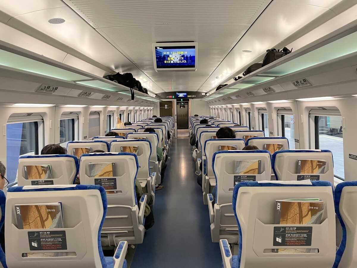 車内はきれいで、座席の感覚も広く、約2時間ならこれで十分だった。日本語の案内も時折あるが、基本は韓国語と英語である。