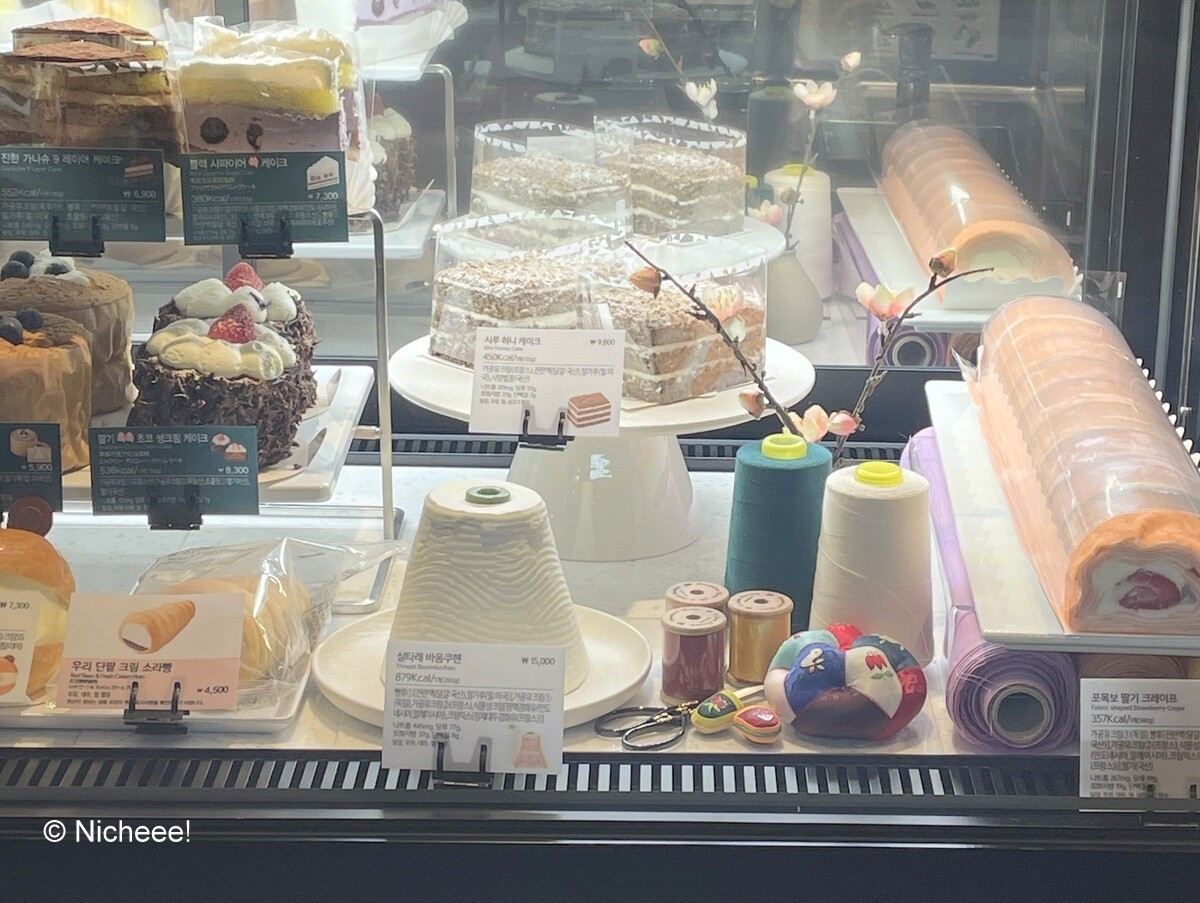 店内では、糸や布の生地をモチーフとしたインテリアもいくつか見られる。限定メニューにある、コーン巻をイメージしたスイーツが、広蔵市場らしい。特に、市場の1階が見えるカウンター席はおすすめ。