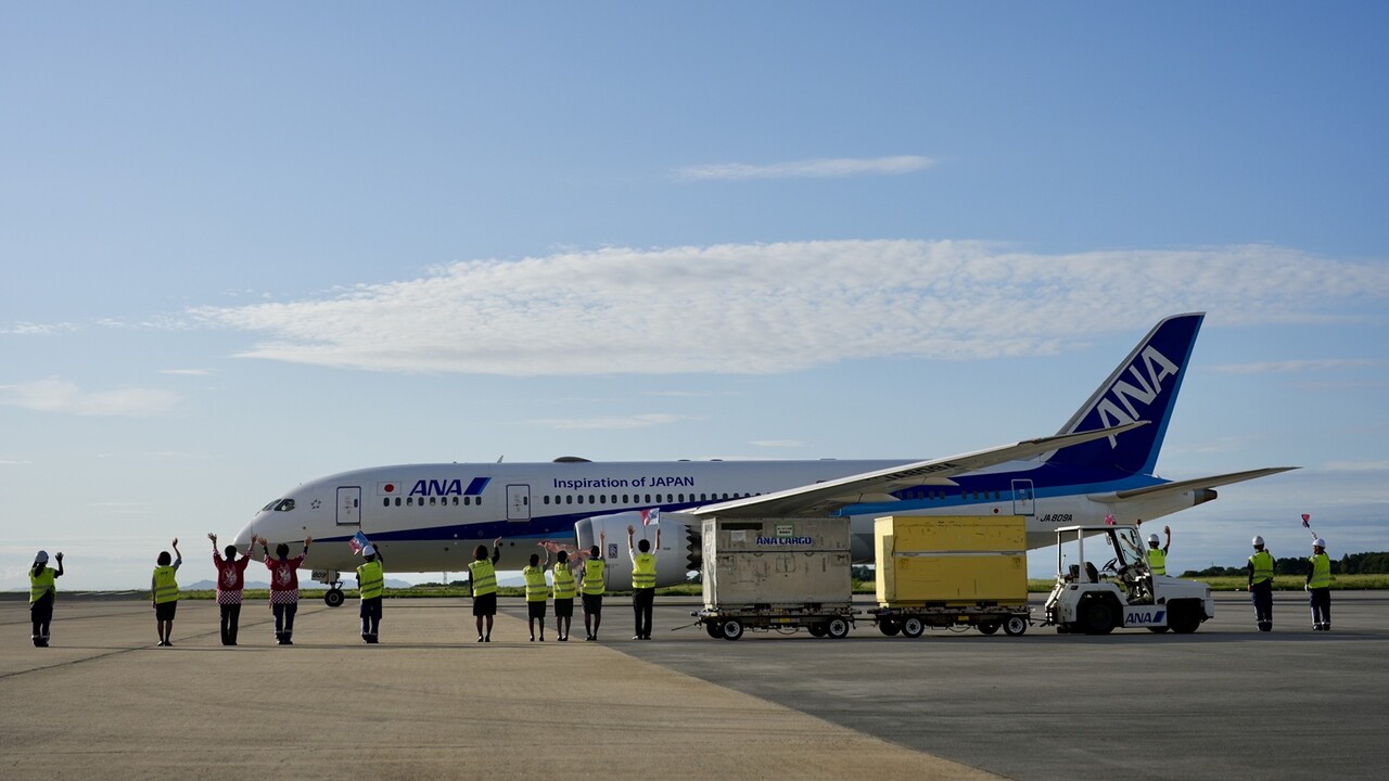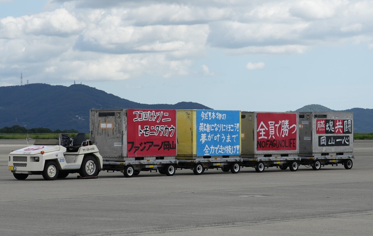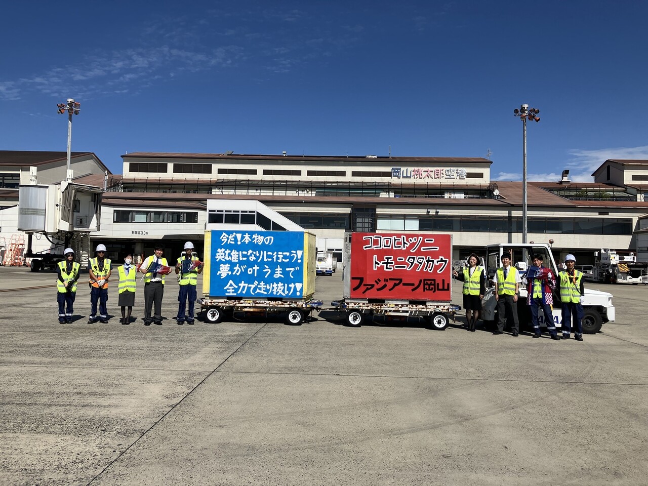 岡山空港で、飛行機の地上業務など行う両備グループによる「両備ファジアーノ全力応援プロジェクト」の一環。ANAとJALの協力のもと、実現したという。