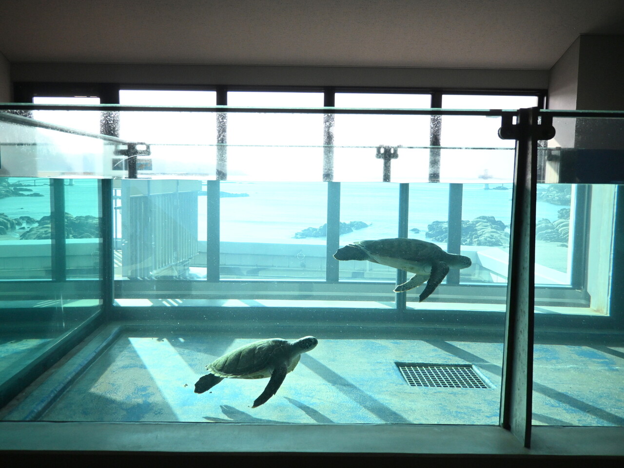そして、竜串湾を背景に泳ぐウミガメは必見。ユーラシアカワウソもかわいく、ガラス越しとはいえ、とても近い距離で見られる。写真映えスポットもいたるところにある。