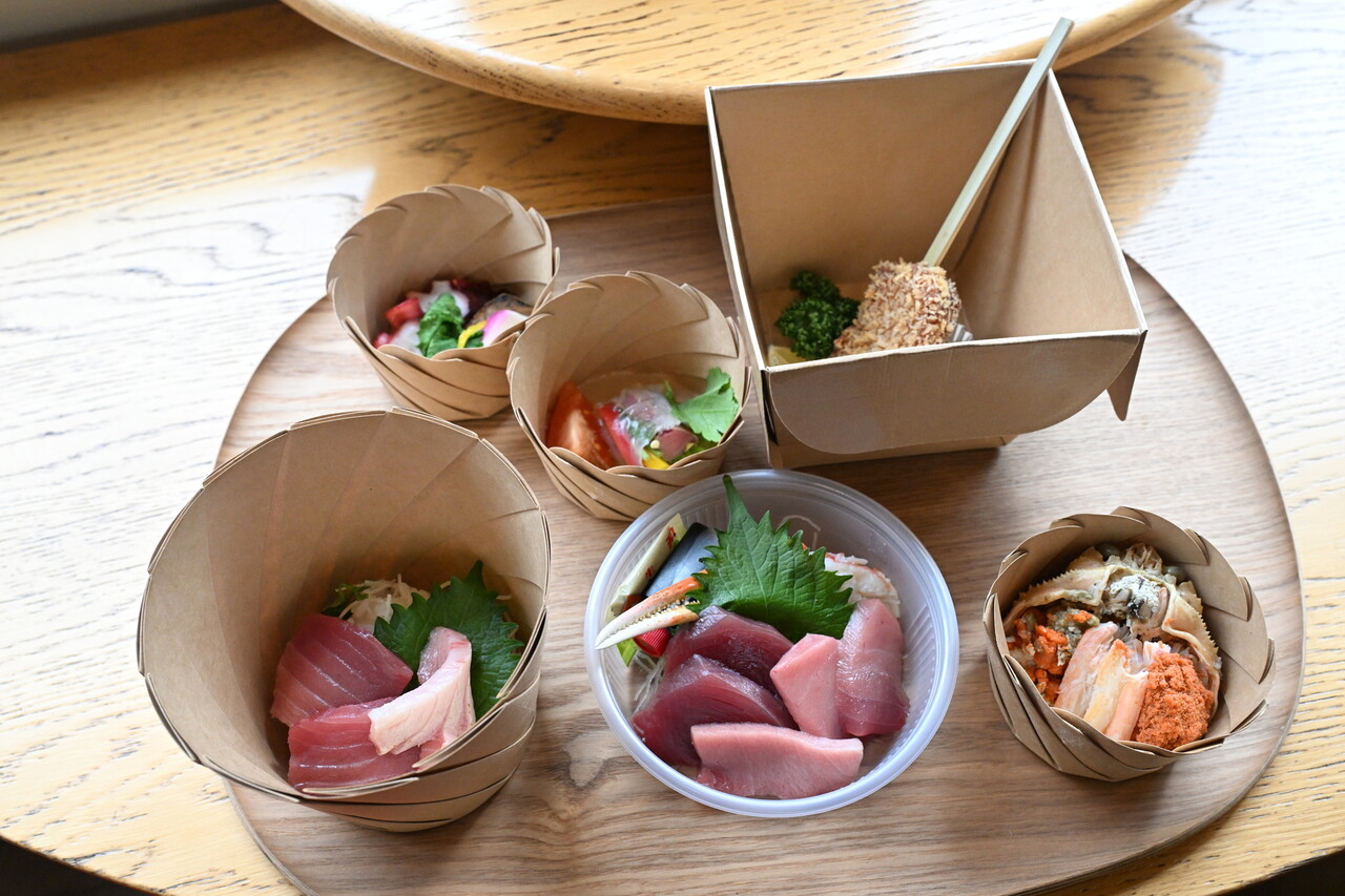 その車内で提供されるマグロ料理は、舞鶴市内で人気の海鮮料理店「新鮮処魚里」が手がける。刺身や丼、生春巻や串かつなども。まさにクロマグロづくしの料理の数々がそろう。