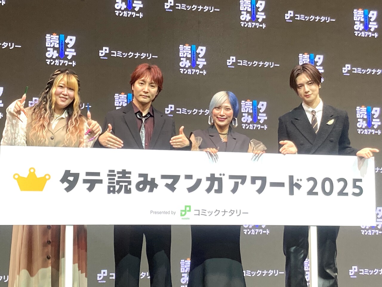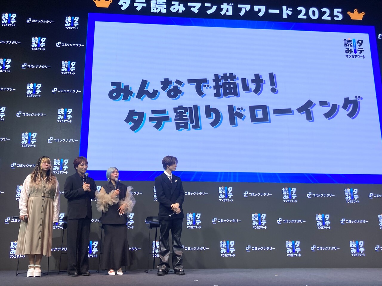 マンガやアニメ専用のニュースサイト「コミックナタリー」は2月18日、都内で「タテ読みマンガアワード 2025」を開催した。コミックナタリーが12月1日から22日まで好きなマンガ投票を行い、約12万票の中で一位に輝いた作品の授賞式を行ったほか、ゲスト審査員に、芸人のぱーてぃちゃんとINIの佐野雄大さんを迎え、審査員特別賞を受賞した後は、「みんなで描け!タテ割りドローイングゲーム」などを行った。